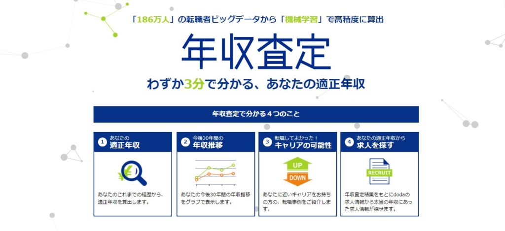 自分の適正年収を知りたいなら、dodaの年収査定を活用してみましょう。査定は3分ほどで完了するため、空き時間を活用して試してみてください。