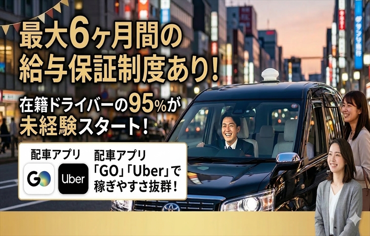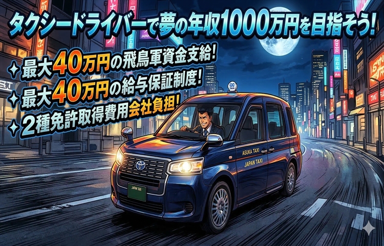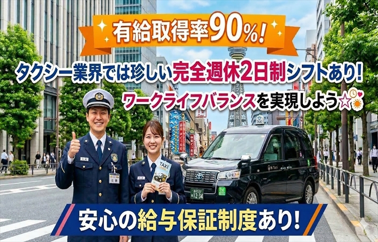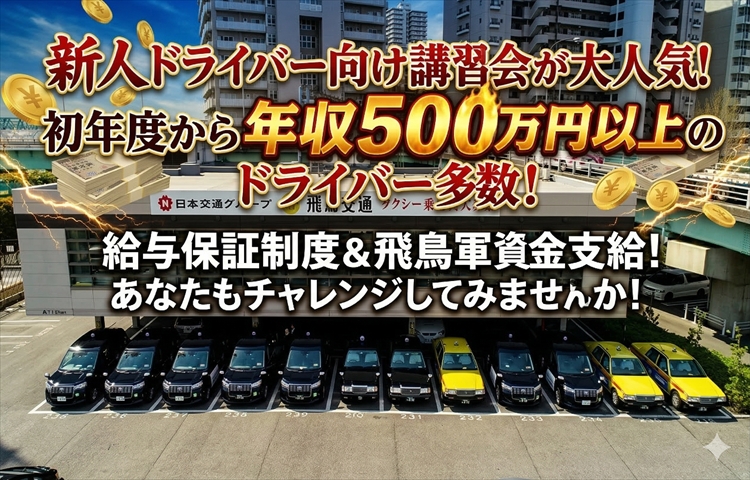 業界最大手の日本交通グループ加盟企業!研修制度もバッチリ!配車アプリ「GO」導入で地理に不安のある方でも安心!給与保証制度や飛鳥軍資金の支給あり!