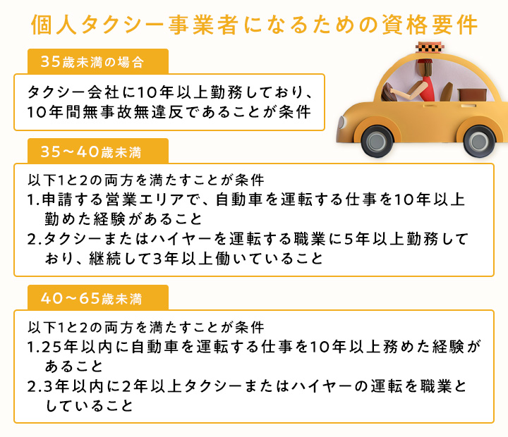 個人タクシーを申請するにはまず65歳未満でなければならず、最短で10年以上の経験が求められます。