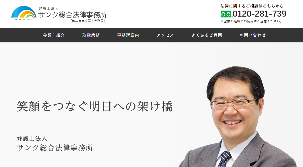 弁護士法人サンク総合法律事務所は、企業顧問、債務整理、不動産などに関する問題を取り扱っている弁護士事務所です。