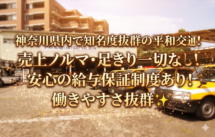 6ヵ月間の給与保証あり!1年間寮費無料の寮完備!地方在住者の応募も大歓迎!神奈川県下トップクラスの規模を誇る、平和交通で働きませんか!安心して働けるタクシー会社!