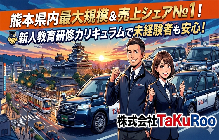 熊本県下最大級のタクシー会社として多くのお客様に認知されているのがTaKuRooです!業界未経験スタートでも乗務開始初月から安定して仕事が入ってくる環境!だからこそ安心してチャレンジでます!2種免許取得費用は会社負担!スタートしやすい環境が整っています!
