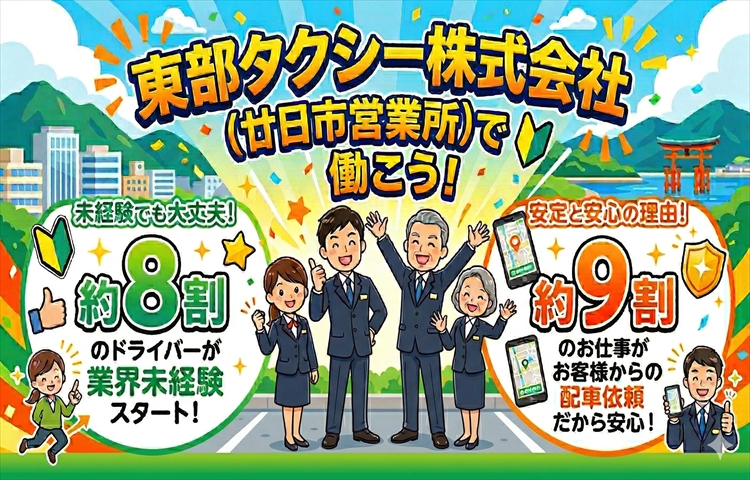 ドライバーの約8割が業界未経験からのスタート!充実した研修で未経験者も安心!2種免許取得費用会社負担!昼・夜、選べる勤務スタイル!東部タクシー(廿日市営業所)の求人情報!