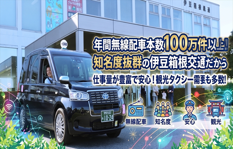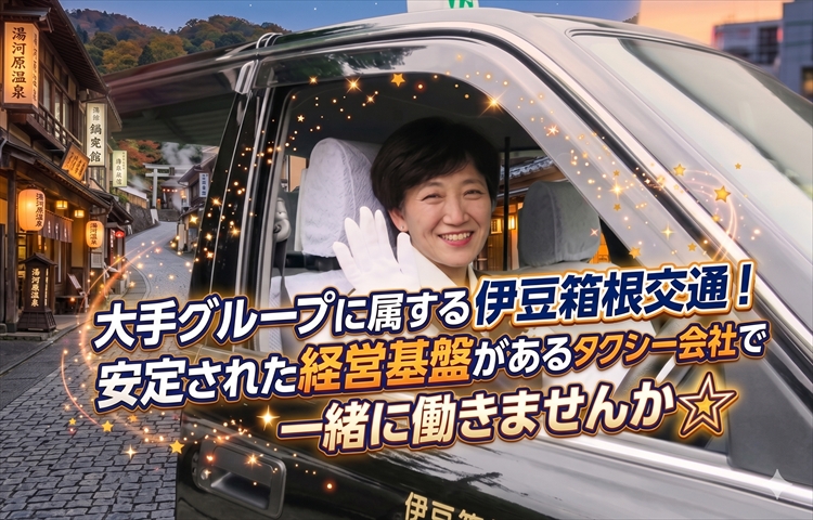 入社後6ヵ月間の給与保証制度あり!年間無線配車本数100万件以上!観光タクシーの仕事あり!営業所内みんな仲良し!伊豆箱根タクシーグループの求人情報!