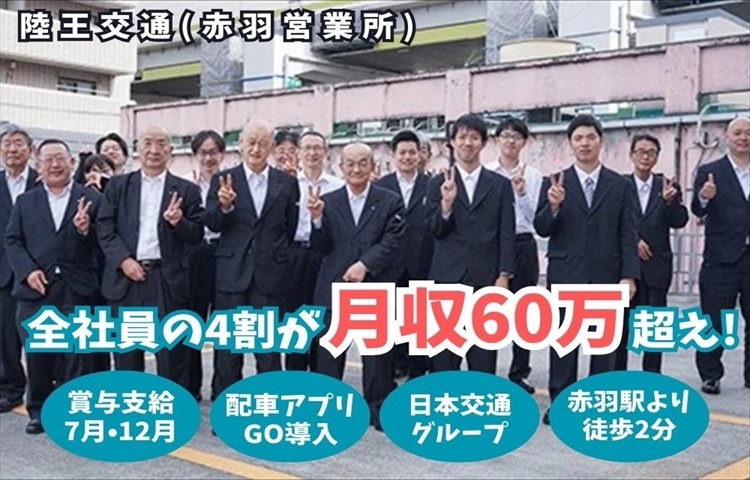 業界未経験OK!最寄り駅から徒歩2分の好立地!給与保証制度あり!賞与年2回支給あり!日本交通グループ所属で仕事量多数あり!陸王交通(赤羽営業所)の求人情報!