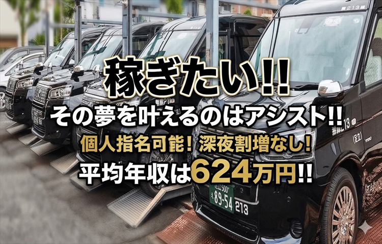 とにかく稼ぎたい!夢を実現する為にお金が必要!そんな野心を持った方大歓迎!平均年収は驚異の624万円!トップドライバーは年収1000万円以上!高収入を実現しているアシストタクシーの求人情報!
