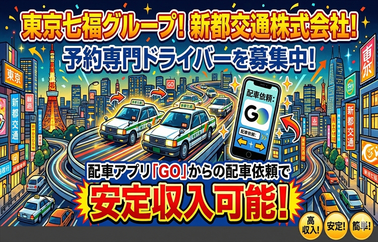 東京七福グループの新都交通が予約専門タクシードライバーの募集を開始!業界未経験者大歓迎!2種免許取得費用会社負担!給与保証制度や入社支度金も準備!新都交通の求人情報!