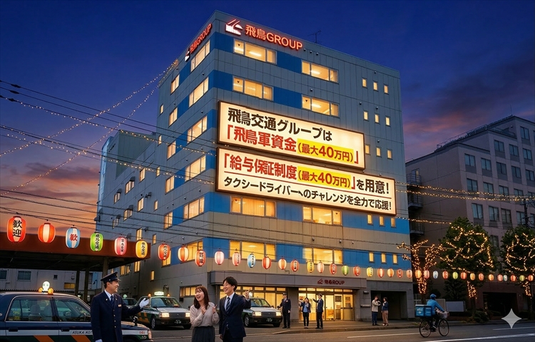 業界最大手の日本交通グループ加盟企業!研修制度もバッチリ!配車アプリ「GO」導入で地理に不安のある方でも安心!給与保証制度や飛鳥軍資金の支給あり!