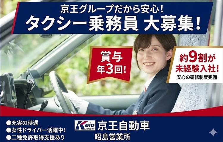 多摩地域で年収500万円~700万円以上稼げる!配車件数エリアでトップクラス!多摩地区で圧倒的な知名度を誇る京王自動車(京王グループ)!入社祝い金&給与保証あり!福生営業所の求人情報!
