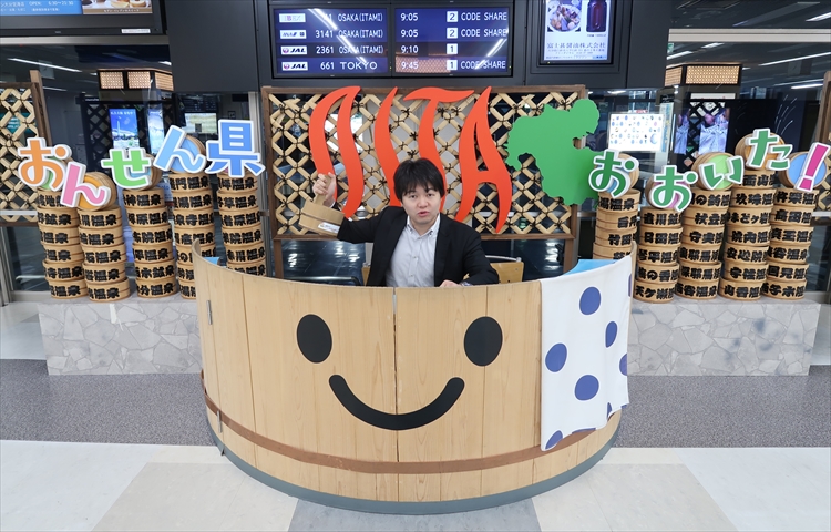 ▲いきなりカワイイ風呂桶を発見!せっかくなので記念撮影しておきます。「おんせん県おおいた!」そうです。大分県は温泉で有名ですよね!温泉でも入って飛行機移動の疲れを癒したいな~。なんて思っていたらまさかの!!