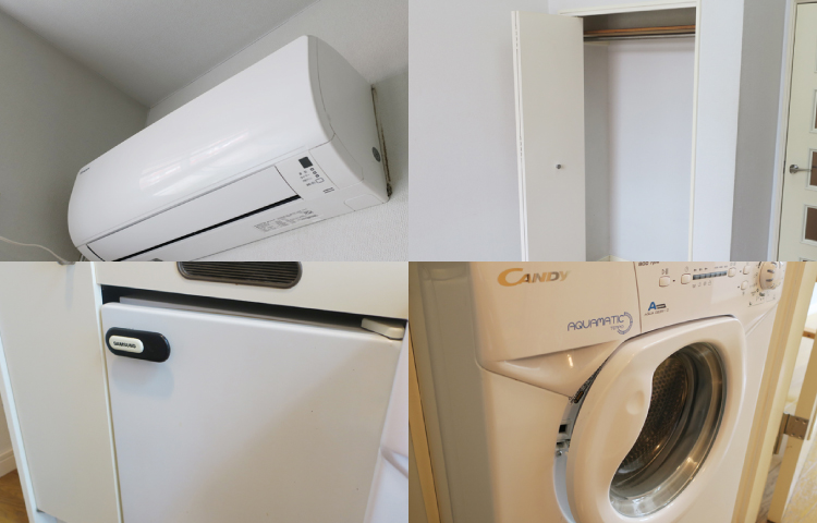 ▲エアコン、冷蔵庫、洗濯機、クローゼットが完備されています。