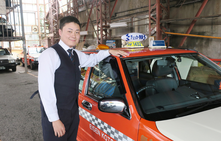 お疲れのところ、カメラ目線で笑顔をいただけました!西山さんをはじめ、20代の若手ドライバーさんが数多く活躍されていることも栄泉交通さんの特徴です。