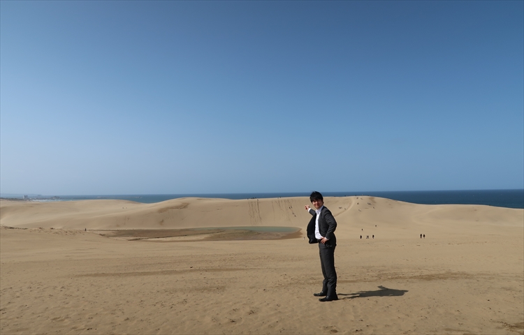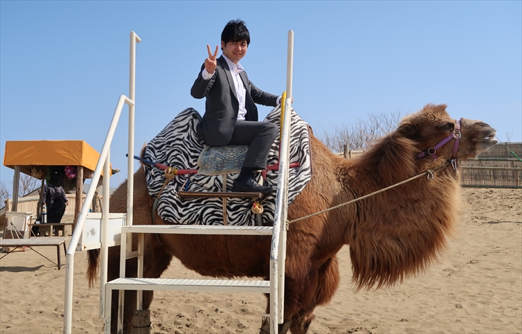 そう!鳥取砂丘です。広大な砂漠に綺麗に済んだ青空。。。心が洗われ清らかな心を取り戻せそうです。で、せっかく鳥取砂丘に来たらなば、彼に股がらないとね!
