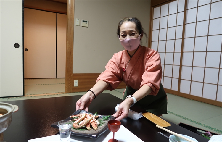 仲居さん:焼き蟹をお持ちしました。熱いうちにどうぞお食べ下さい。