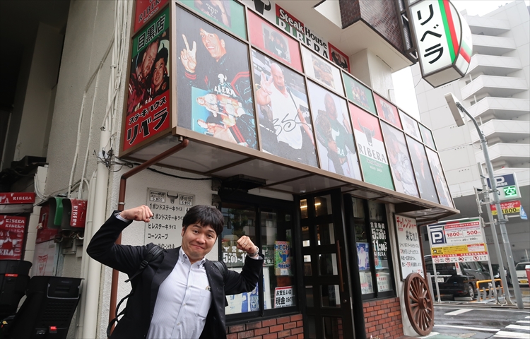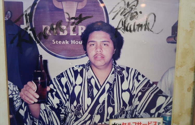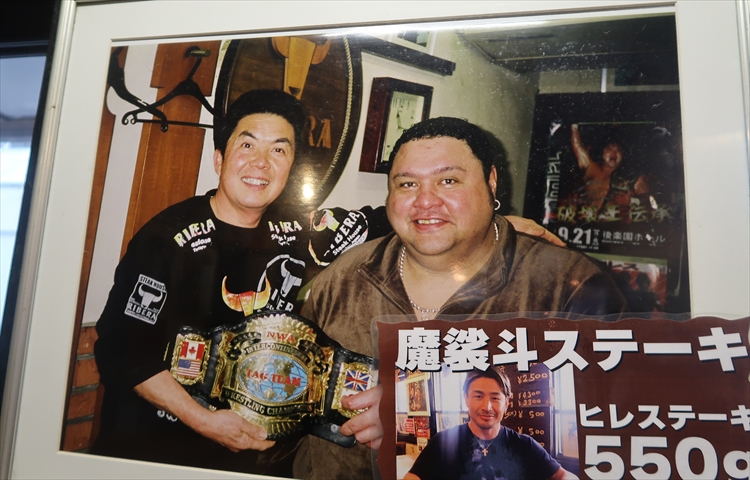 ▲魔裟斗とツーショット風の写真を撮りながら横綱ステーキを待ちます。どうやらリベラさんは格闘家御用達のお店みたいで、曙さんや魔裟斗さん以外でも、那須川天心さんや武尊さん等、有名格闘家の写真がたくさん飾ってありました!そんな写真を眺めていると。。。