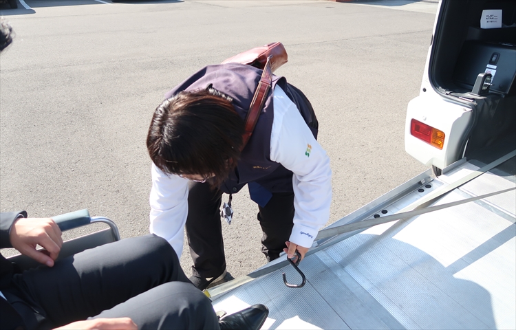 大林さん:車両にお乗せする前に車椅子が倒れないようにしっかり固定します。