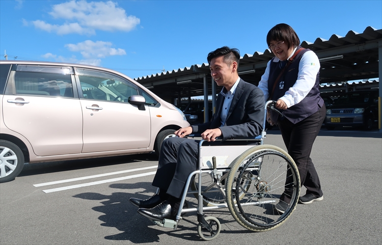 大林さん:こちらが福祉輸送車両です!今から礒部さんを車椅子にお乗せして車両の中まで運ばせていただきます。