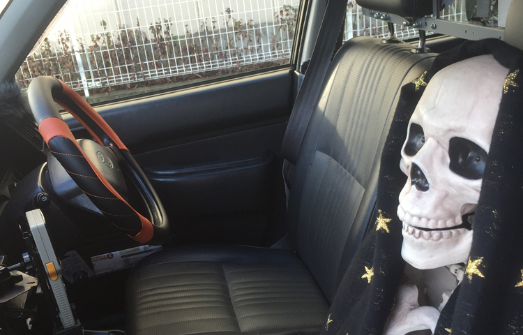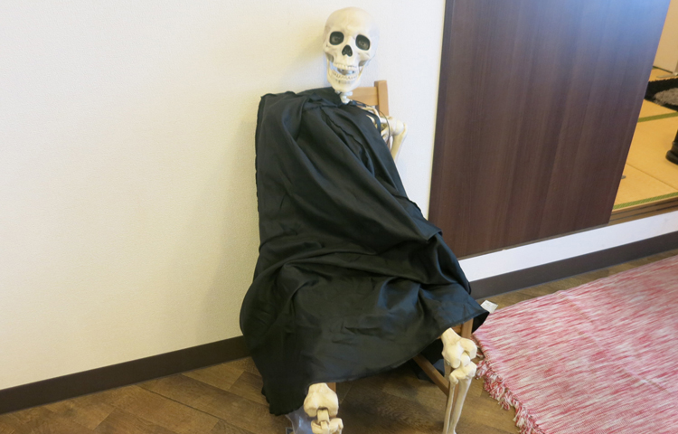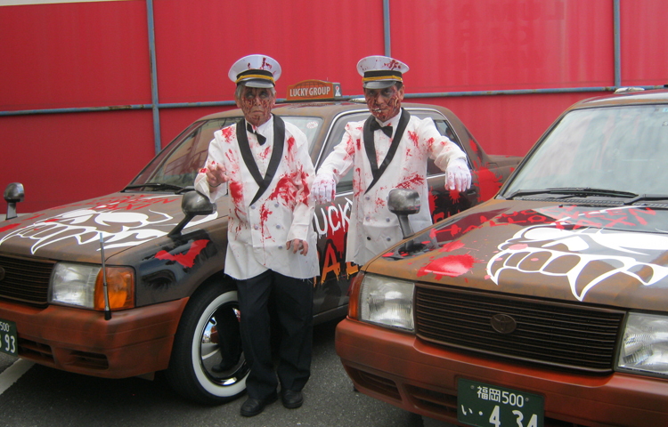 ゾンビはタクシー運転手が仮装していて、骸骨は助手席に乗せて福岡市内を走るんです!せっかく取材に来ていただいたので準備しておきました。