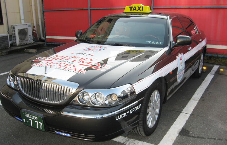 ▲クリスマスには高級外車リンカーンを1日だけの特別タクシーとして採用。もちろん運賃は一般タクシーと同じです。ナンバーもスリーセブンですし、このリンカーンタクシーに乗れた人は幸運ですね!