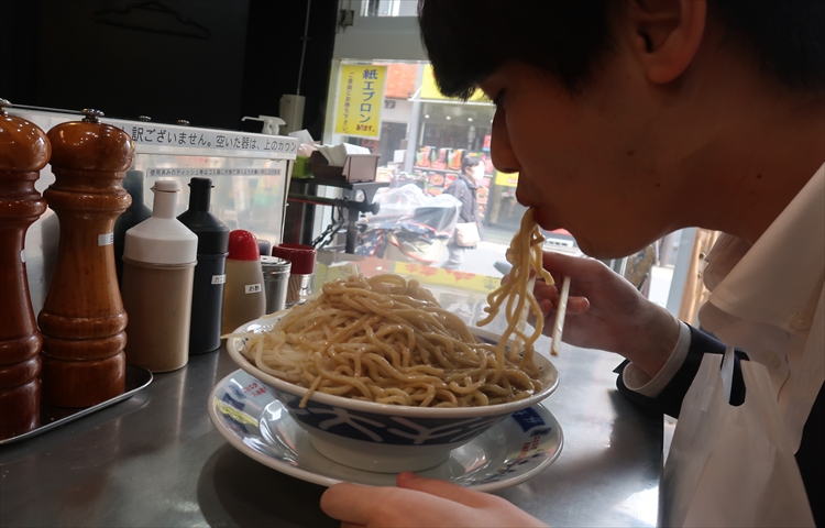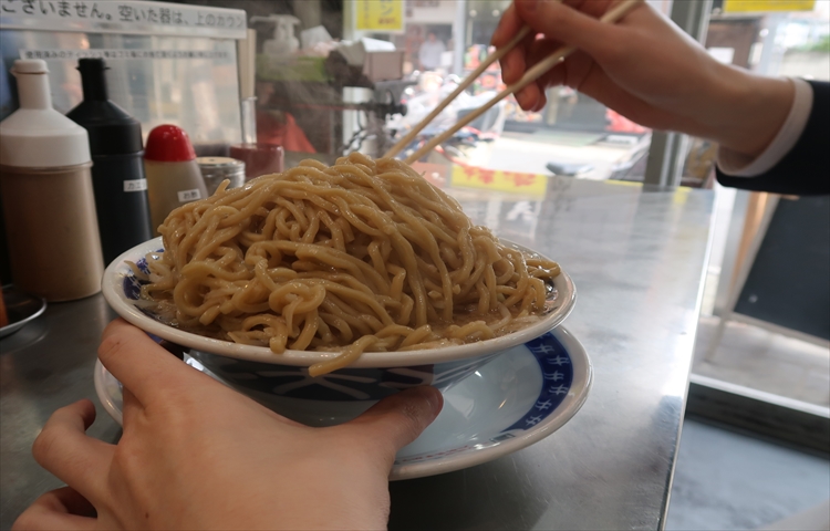 ▲必殺技の天地返しを繰り出し、まずは麺から頂きます!
