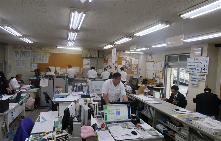 ▲こちらは出庫・帰庫の点呼を行う受付。これから乗務の人や、乗務を終えた人が戻ってきていて、人がたくさんいますね。