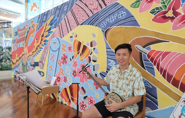 ▲那覇空港には沖縄県に古くから伝わる伝統的な弦楽器「三線(さんしん)」を体験できる場所もあります。三線を手に取ること自体生まれて初めてです!
