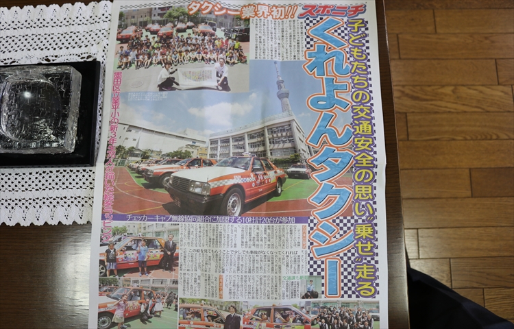 立川常務:そうそう、子どもたちに交通安全を啓発する絵を描いてもらい、それをタクシーにラッピングするの。当時これがすごく好評で新聞にも取り上げられたんだよ。その時の記事があるから、ちょっと見てみてよ。