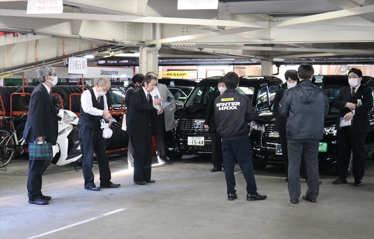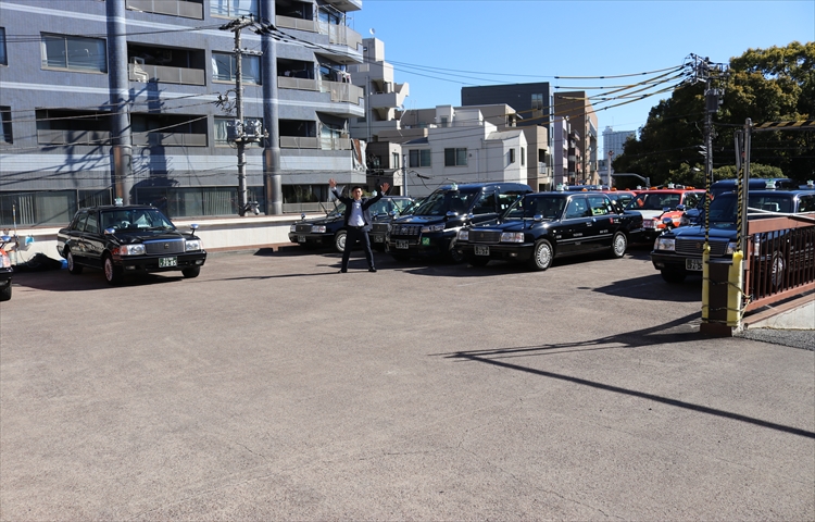 ▲ここからは屋外にある施設を見学させていただきます。まずは1階にもある車庫から。こちらにもタクシーの車両がずらっと並んでいて壮観です!