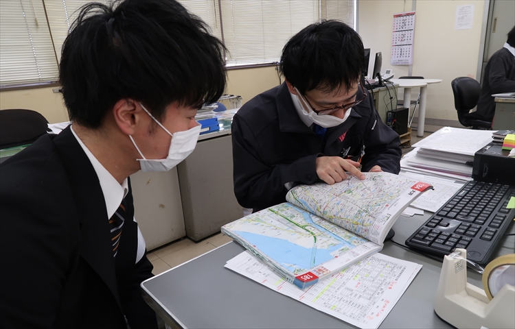 ▲ちなみにこちらが西尾さんと新人ドライバーさんの研修の様子。地図を見ながら熱心に指導されています!一人ひとりの習得度合いに合わせて研修期間を調整してくれるのも安心ポイントです。