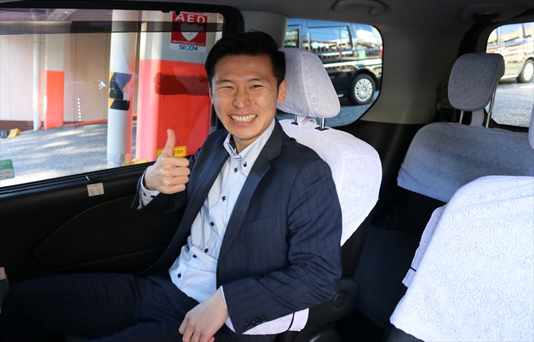 ▲わたくしイケメンが、あっ間違えた、礒部がお客様役となって後部座席に乗せていただきます!